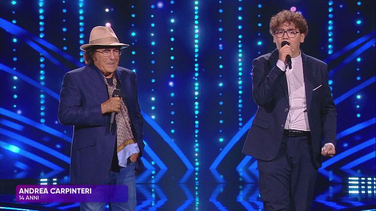 Al Bano e Andrea Carpinteri, dall'edizione passata di "Io Canto Generation", cantano insieme sul palco.