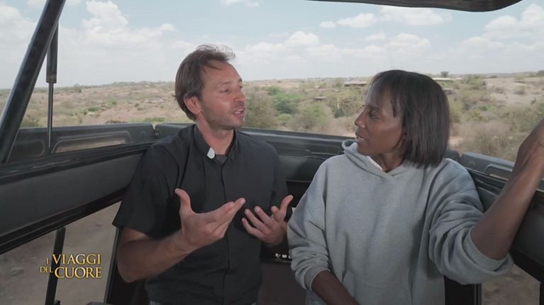 Don Davide Banzato e Fiona May, testimonial di Missioni Don Bosco, si trovano nel Nairobi National Park, il primo parco nazionale del Kenya.