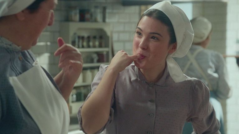 Virtudes indossa il suo nuovo vestito da cuoca e si diverte in cucina con la madre.