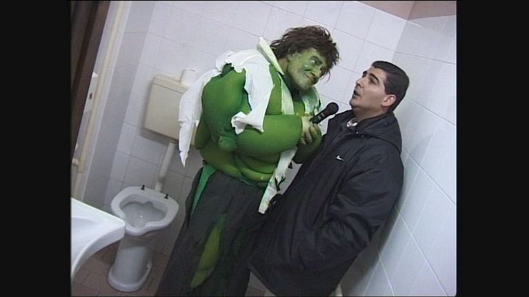 Giulio Golia nei panni di Hulko. I bagni pubblici vengono messi a pagamento e funzionano solo con le monete