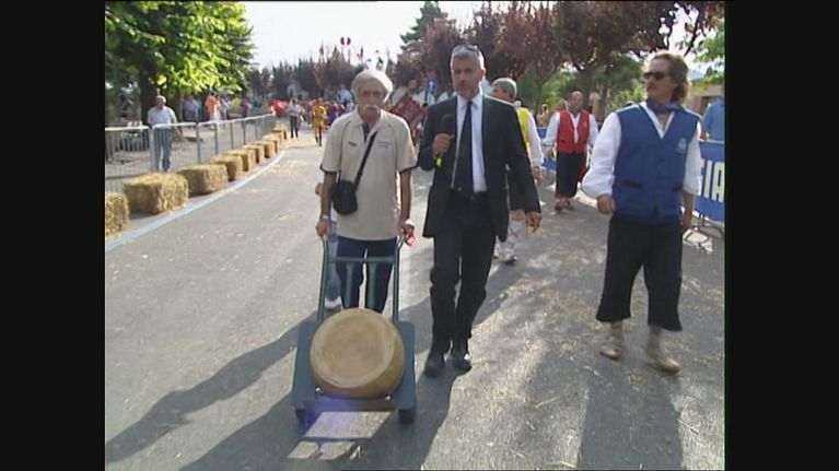 Enrico Lucci finisce ad Alatri dove si gareggia al lancio del formaggio