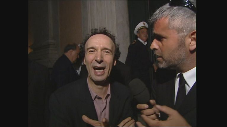 La Iena Enrico Lucci incontra Roberto Benigni per parlare di Enzo Biagi che non è più in televisione