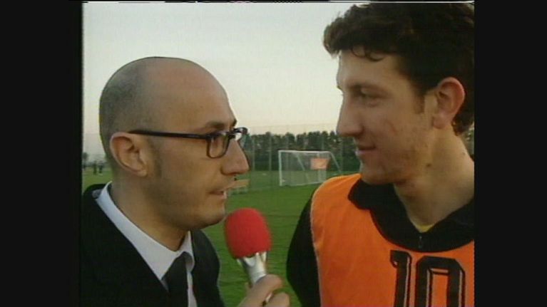 Peppe Quintale intervista alcuni calciatori della Lazio il giorno prima della partita contro l'Auxerre