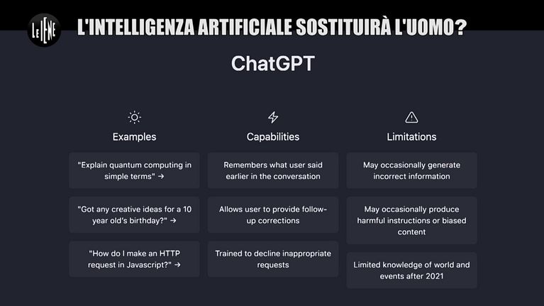 L'intelligenza artificiale con ChatGPT ha sorpreso tutti. Con le sue reti neurali dà vere risposte nuove alle nostre domande. Da come cucinare a come crearci siti, poesie, canzoni, articoli, traduzioni, sintesi, compiti, tesi di laurea... Con Matteo Viviani e Marco Fubini vi spieghiamo i suoi limiti e come potrebbe rivoluzionarci di nuovo la vita. L'abbiamo anche provata per voi. A proposito, proverà sue sensazioni? Ci possono essere usi non corretti?