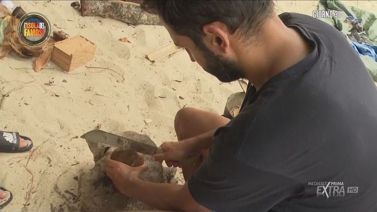Circondato dai suoi compagni, Aras apre un cocco e lo distribuisce.