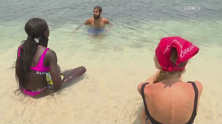 Durante un rilassante bagno in mare, Aras racconta a Khady quanto fatto durante la sua sessione di pesca mattutina.