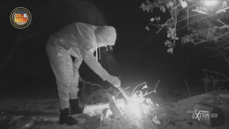 Pietro si gode la sua serata su Playa Coco: dopo aver mangiato una porzione di riso, si dedica alla sistemazione del fuoco.