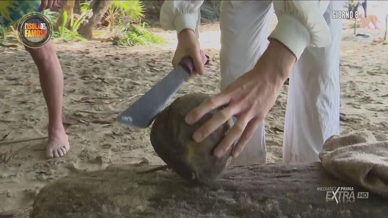 Pietro, con l'attenta supervisione di Francesco e Daniele, prova ad aprire il suo primo cocco.