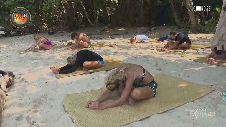 Matilde dà il via ad una nuova sessione di stretching in riva al mare.