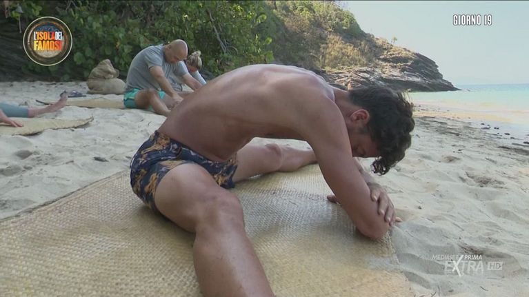 Samuel dà il via ad una nuova sessione di stretching in riva al mare.