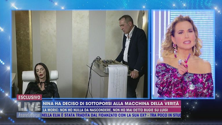 Nina Moric risponde alle domande di Barbara D'Urso mentre si sottopone alla macchina della verità, in sottofondo le risate della mamma di Luigi Favoloso