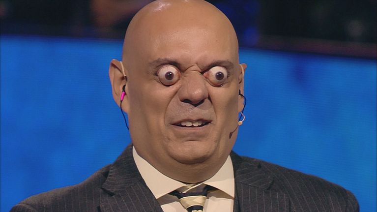 Gerry Scotti intervista Sidney De Carvalho Mesquita, l'uomo con la maggior fuoriuscita dei bulbi oculari (18,2 millimetri).