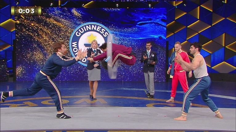 Il gruppo acrobatico Hoops Désolé per battare il record devono fare almeno 20 salti dentro un hula hoop lanciato tra due persone entro 30 secondi.
