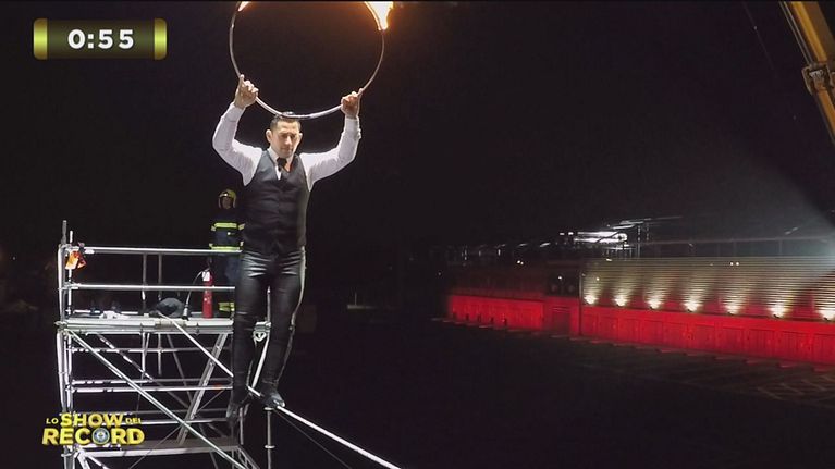 Henry Ayala tenterà di eseguire almeno 10 salti con un cerchio infuocato in equilibrio su una fune in un minuto.