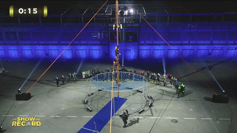 La circense Romy Meggiolaro prova a battere un ipnotico record: far roteare simultaneamente con mani e piedi 4 tappetini stando sospesi in aria a testa in giù per un minuto e trenta secondi.
