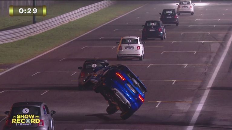 Terry Grant è un esperto di imprese a quattro ruote e il record da battere è: eseguire su un'auto su due ruote uno slalom tra 10 auto entro 53.39 secondi.