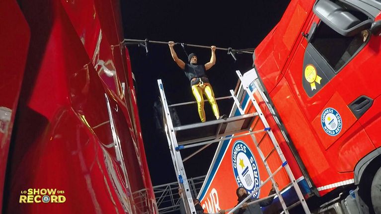 Tazio deve eseguire almeno 11 trazioni consecutive su una sbarra tra due tir in movimento.
