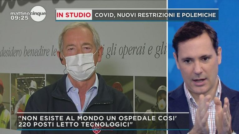 Bertolaso, dopo aver precisato che la struttura in fiera è stata realizzata solo con donazioni private, dichiara in merito alla competenza del commissario Arcuri:" L'emergenza non si può inventare".