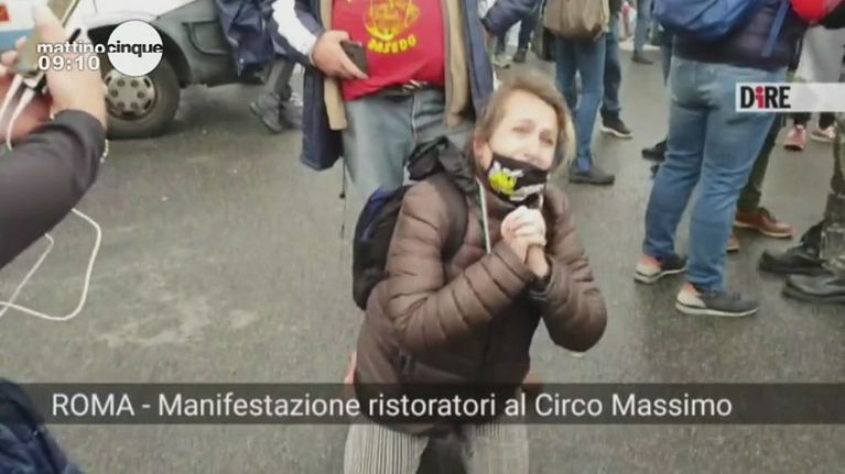Chiara, le sue attività chiuse da mesi, si inginocchia, disperata, durante la manifestazione tenutasi a Roma.