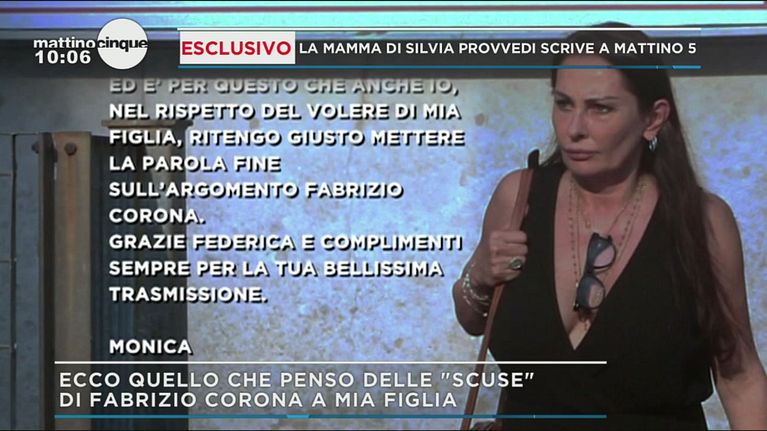 Inizia con parole di ringraziamento per la trasmissione Mattino 5, la Signora Monica parlando delle scuse di Corona alla figlia, dice di voler mettere la parola fine a questa faccenda come ha fatto Silvia.
