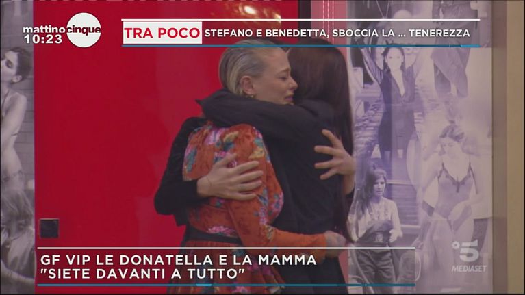Monica, la mamma di Silvia e Giulia Provvedi, entra in casa per dare un lungo abbraccio alle figlie.