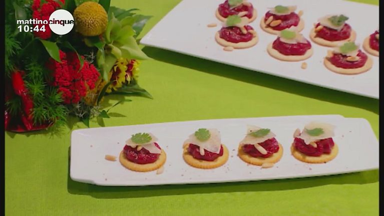 Uno spuntino a base di crackers, barbabietole e pinoli.