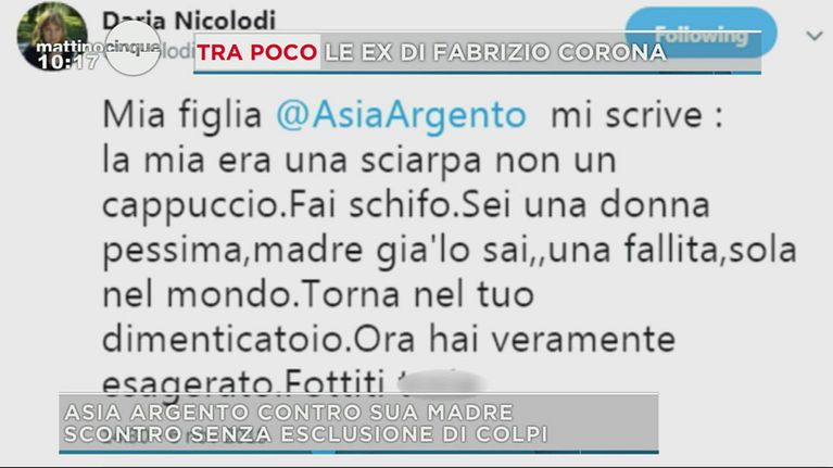 La mamma di Asia esprime sui social il proprio disappunto per la relazione tra la figlia e Corona, la risposta dell'attrice non si fa attendere con un sms molto duro.