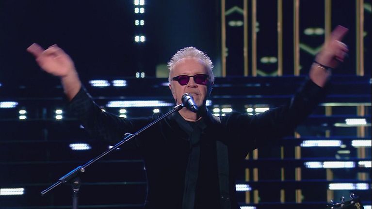 Eros Ramazzotti si esibisce sul palco di "Michelle Impossible" con uno dei suoi più grandi successi.