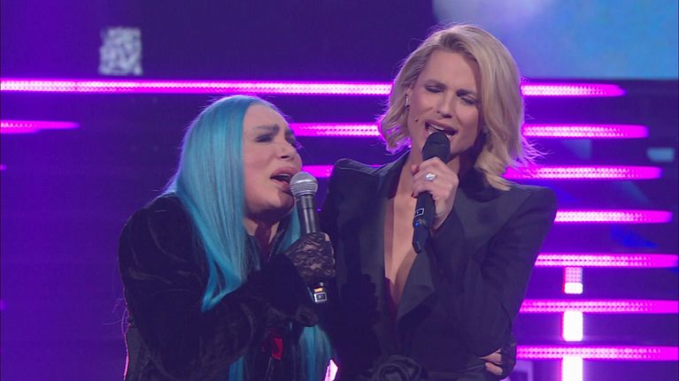 Loredana Bertè e Michelle Hunziker cantano insieme il brano "Dedicato" e presentano il cofanetto Reloaded 1974-1983.