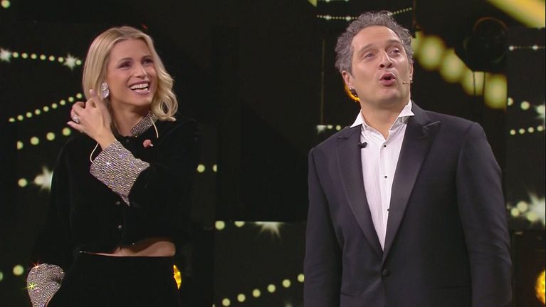 La Gialappa's Band mostra a Michelle Hunziker e a Claudio Santamaria alcune scene tratte da "Chicken Park".