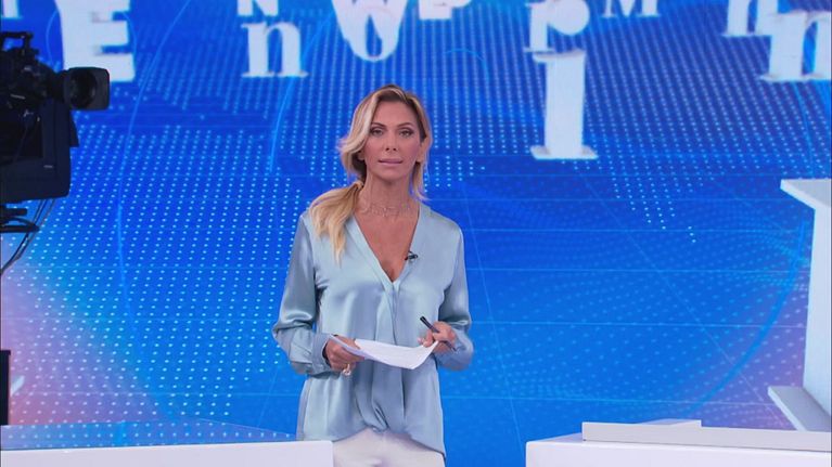 Simona Branchetti conduce in diretta il programma di informazione di Canale 5.