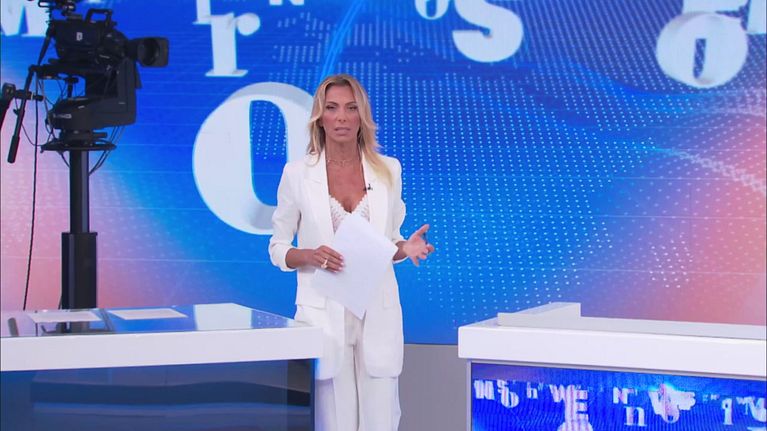 Simona Branchetti conduce in diretta il programma di informazione di Canale 5.
