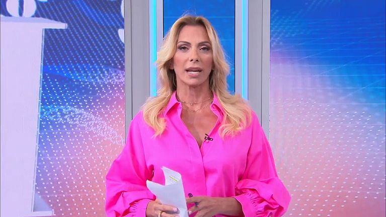 Simona Branchetti conduce in diretta il programma di informazione di Canale 5.
