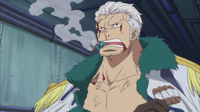 Franky comincia a combattere contro Baby 5 e Buffalo mentre Law, il G-5 e la ciurma di Cappello di Paglia, con l'arrivo degli ultimi rimasti, fuggono a bordo di un vagone dal laboratorio di Caesar. Questi si risveglia e si ricorda di avere ancora con sé il cuore di Smoker, datogli da Law, e si prepara a trafiggerlo per vendetta. Mone, intanto, si mette in contatto con Do Flamingo che le ordina di azionare l'autodistruzione del laboratorio dopo essersi scusato con lei e Vergo; l'arpia, sicura che il suo padrone diventerà il Re dei pirati, si prepara ad azionare il dispositivo.