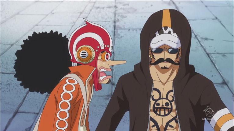Rufy incontra Bellamy mentre viene trasportato in infermeria e Bartolomeo sente quest'ultimo chiamarlo "Cappello di Paglia". Nel frattempo, Law, Robin, Usop e Caesar cominciano ad attraversare il ponte che porta a Green Bit: il gruppo viene attaccato dal banco di pesci combattenti che abita la zona, ma i quattro riescono a sconfiggerlo, anche perché alcune misteriose voci catturano una delle bestie; grazie ai poteri dello scienziato, tenuto in scacco da Law, i quattro raggiungono Green Bit, caratterizzata da una foresta con piante gigantesche. Sanji, intanto, dopo aver sconfitto gli uomini che Violet gli aveva indicato, viene ammanettato dalla ragazza.