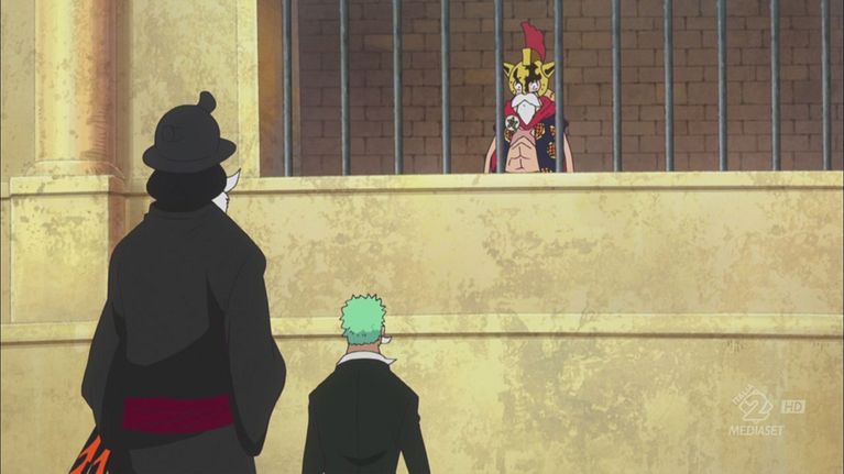 Bellamy si avvicina a Luffy per ucciderlo, ma decide di non eseguire l'ordine impartitogli; viene raggiunto da Dellinger, un ufficiale di Do Flamingo che lo attacca dicendogli di avere ricevuto l'ordine di ucciderlo in ogni caso. Lo scontro fra Law e Do Flamingo, intanto, volge a favore di quest'ultimo, che viene informato da Diamante via lumacofono del tradimento di Violet; Do Flamingo gli ordina quindi di inviare gli ufficiali alla fabbrica e di occuparsi da solo della finale del torneo.