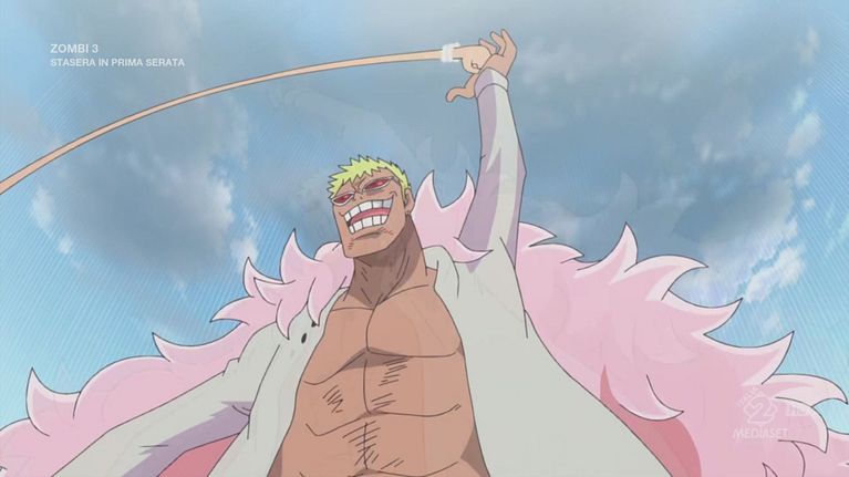 Re Riku riesce a far desistere i cittadini che li hanno catturati e, assieme al sopraggiunto Fujitora, dichiara di volere scommettere su Luffy per la salvezza di Dressrosa. Intanto Law cerca di infliggere il colpo di grazia a Trébol, ma viene fermato da Do Flamingo che, con l'aiuto del suo clone, contrattacca infliggendo un duro colpo a Law e successivamente a Luffy. Do Flamingo afferma quindi di essere nato come Drago Celeste: il padre, tuttavia, rinunciò al suo titolo per vivere tra la gente comune che, però, non li accettò mai; all'età di dieci anni, Do Flamingo lo uccise e portò la sua testa ai Draghi Celesti per riavere il suo rango, ma anche questi lo cacciarono. Fu a questo punto che decise che avrebbe portato il caos nel mondo.
