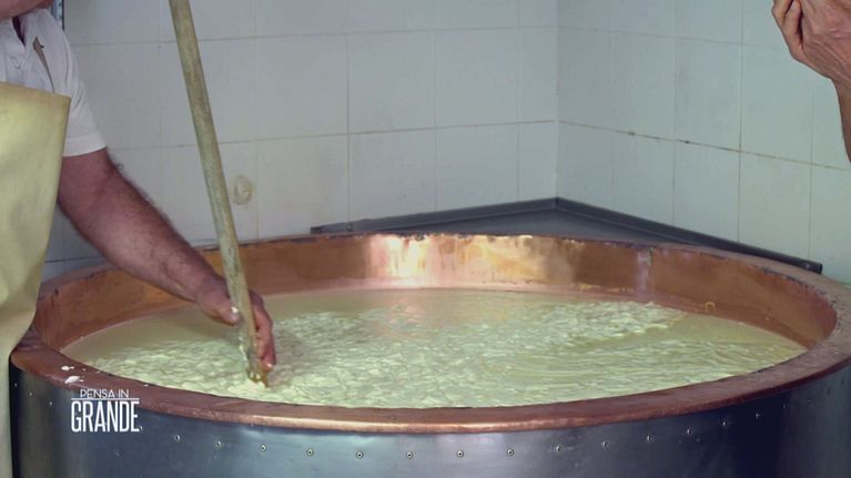 Un processo che ha qualcosa di miracoloso: il taglio della cagliata. Il latte dopo la messa in caglio è diventato una grande massa che deve essere tagliata progressivamente in granuli sempre più piccoli. Questi poi si separano dal siero e verranno cotti
