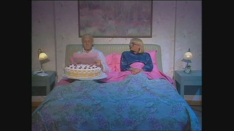 Raimondo Vianello è a letto con la sua torta di compleanno. Ma sua moglie ha qualcosa da ridire...