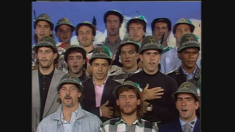 rotagonisti Elio e le storie tese e un gruppo di allenatori e calciatori, vestiti prima da alpini e poi in smoking