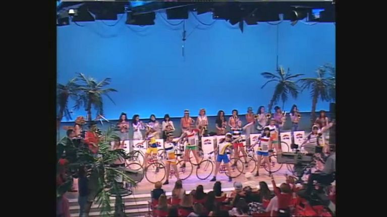 1993, Paolo Bonolis insieme ad alcune delle ragazze sulle bici ricorda l'appuntamento con il Giro d'Italia