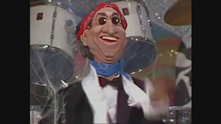 Pippo Baudo si esibisce al Controfestival di Sanremo a cui partecipano i personaggi del Gommapiuma Residence