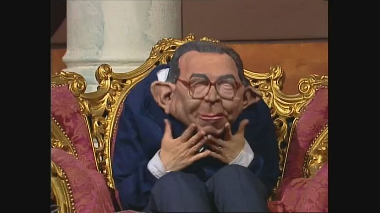 L'atmosfera si scalda a Gommapiuma: Umberto Bossi provoca Giulio Andreotti proponendo uno spogliarello