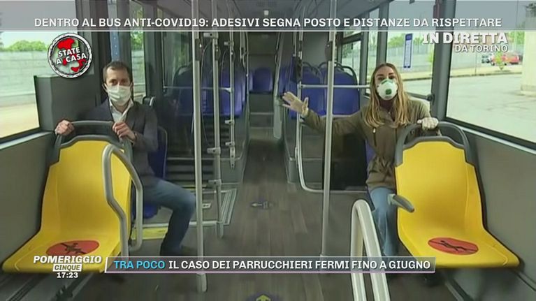 Dentro al bus anti-Covid19: adesivi segna posto e distanze da rispettare.