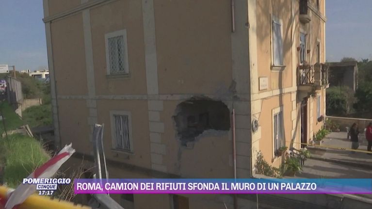 Roma, camion dei rifiuti sfonda il muro di un palazzo