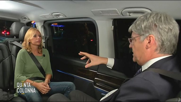 Del Debbio e la sua ospite, Alessandra Mussolini, si recano verso il luogo di culto nella zona di Tor Pignattara a Roma.