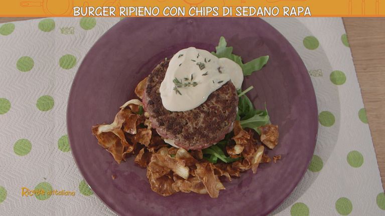 Burger ripieno con chips di sedano rapa