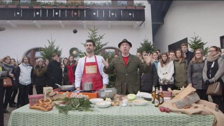 Canederli schiacciati di formaggio con verza stufata, burro e speck croccante rosolato nell'olio.