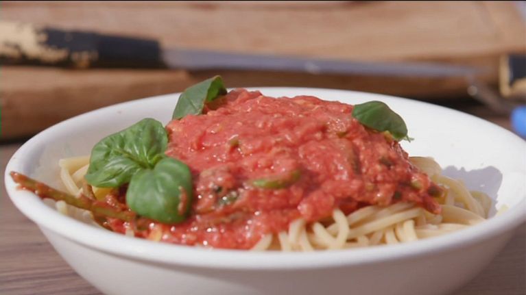 Un primo piatto gustoso con passata di pomodoro, uovo e asparagi per appetiti forti!