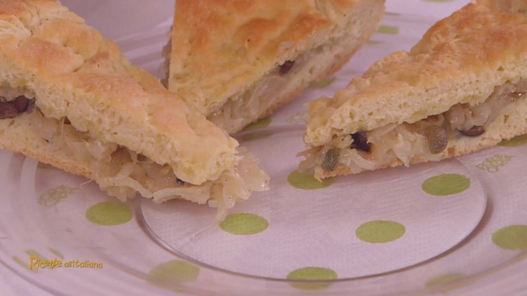 Anna Moroni prepara una fantastica focaccia, tipicamente pugliese, ripiena di cipolle, olive nere, capperi e acciughe